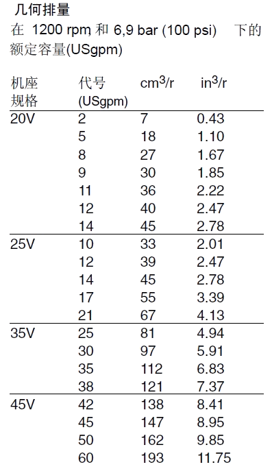 備注:1、排量代號是在1200r/min和0.69Mpa(100psi)下的額定USgpm。2、對于上面所列以外的選擇,即安裝、排量、油口和軸伸請來電。3、轉速限制:a.最低轉速,所有型號和油液搭配600r/min。b.最高轉速:標準型號用抗磨液壓油1800r/min;標準型號用合成液和油包水乳化液1200r/min;用水乙二醇的型號1500r/min。