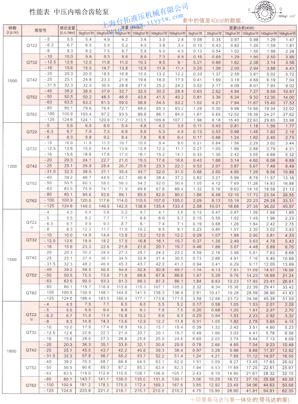 時的功率6P電機 4P電機 6P電機 4P電機 1200rpm 1800rpm 1000rpm 1500rpm QT22-4 140 160 1.7 - 7.5 - 6.4 QT22-5 2.0 6.5 9.8 5.4 8.2 QT22-6.3 2.4 7.9 11.9 6.5 9.9 QT22-8 3.0 9.8 14.8 8.2 12.3 QT32-10 3.8 11.9 17.9 9.9 14.9 QT32-12.5 4.8 15.0 22.6 12.5 18.8 QT32-16 5.9 18.6 28.0 15.5 23.3 QT42-20 7.6 24.1 36.3 20.0 30.2 QT42-25 9.4 29.9 45.0 24.8 37.4 QT42-31.5 12.1 38.5 57.9 32.0 48.2 QT52-40 14.6 45.7 70.3 38.9 58.5 QT52-50 18.7 60.3 90.6 50.2 75.5 QT52-63 23.4 75.9 114.0 63.2 95.0 QT62-80 29.4 95.6 143.7 79.6 119.7 QT62-100 36.9 120.3 181.2 100.4 150.9 QT62-125 45.4 149.0 223.8 124.1 186.4 備注1:本表用于大概的選擇QT泵型號,泵的詳細內容請再參照泵的性能表,還有表中的所需功率N(kw)是在1500rpm額定壓力時的值。