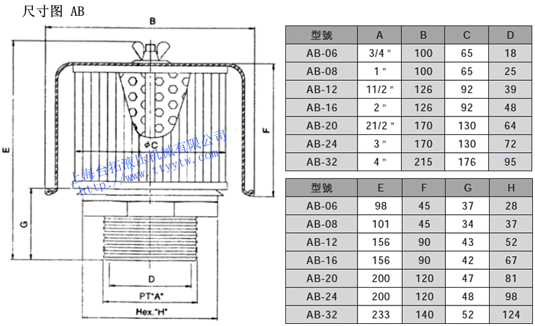 空氣濾清器AB系列加油口裝配于油箱上方,保持油箱里外空氣流動,并防止外部空氣中的灰塵混入油箱。濾網(wǎng)為可拆式設(shè)計,方便清洗更換。