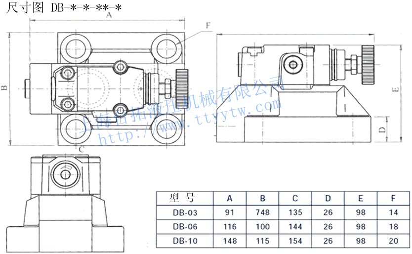 型號 最高使用壓力 MPa 最大流量 ?/min 重量 Kg DB-03-** 35 250 3.4 DB-06-** 500 5 DB-10-** 650 5.9 靜音型先導式溢流閥DB尺寸圖
