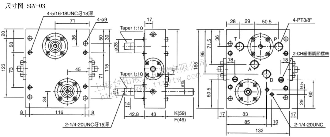 型號 最大流量?/min 最大壓力MPa 口徑 臺面 SGV-03-20 20 4 PT 3/8" 250×500 SGV-03-25 30 300×600 機械式方向閥SGV-03尺寸圖