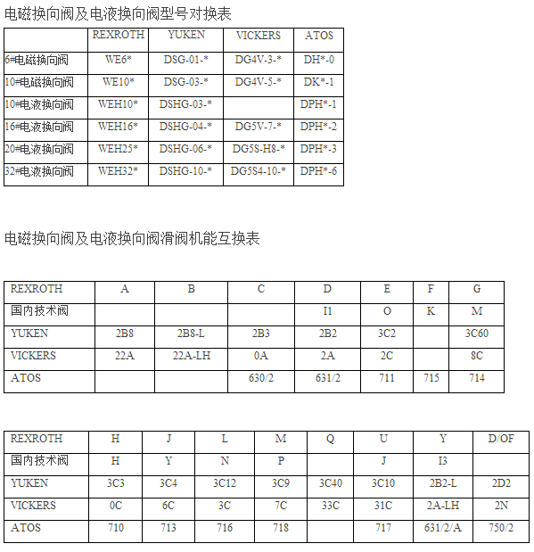 電磁換向閥型號(hào)對(duì)照表(力士樂(lè)、YUKEN、VIKERS、ATOS)