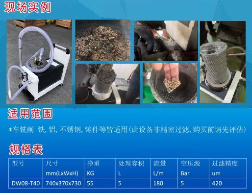 1、吸屑過濾機可以單獨使用,也可以搭配油水凈化循環機使用,只要是和油水有關的設備,都可以處理,讓水箱保持在最健康的狀態。